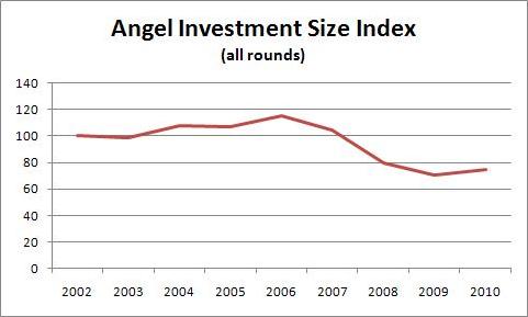 The amount invested in each startup in 2010 was down 35% from its 2006 peak.  Now, the investment amount is not the same as the valuation.  However, for a variety of reasons (anchoring on historical ownership, capitalization table management, and price  equilibrium for the marginal startup), I doubt angels have radically changed the percentage of a company they try to own.  So deal size shifts should be a good proxy for valuation shifts.