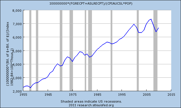 Here are his graph of real per capita federal revenues and my graph of real per capita federal+state+local revenues.