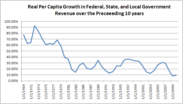 Surprise! Another post on state budgets. Apparently, this topic has become at least a pet peeve and perhaps a mild obsession. Today, I saw that Tyler Cowen replicated a graph from a post by Karl Smith, a professor at UNC. The claim is that government tax revenues aren’t growing as fast as they used to and that eventually this may result in a relative decrease in the role of government. (There’s a backstory of political commentary here that I’m ignoring because it’s not relevant to my point.)