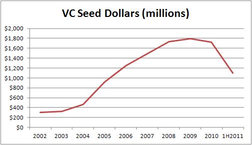 VC seed funding dropped dramatically in 2011. Down 47% in just one year! Average “seed” deal size was down from $4.6M to $2.3M. I’m always hesitant to generalize from one year’s data, but it certainly looks like something might be changing for VCs.