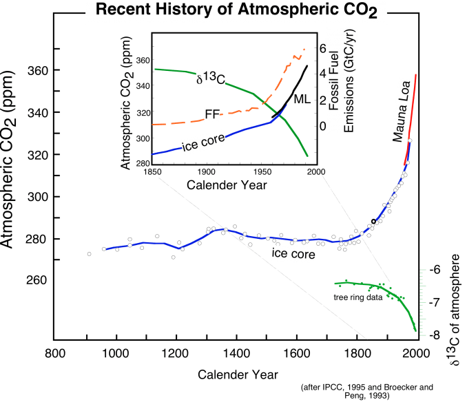 This graph from a Penn State earth sciences class, based on the IPCC’s Second Assessment Report, nicely illustrates the historical atmospheric CO2 situation: