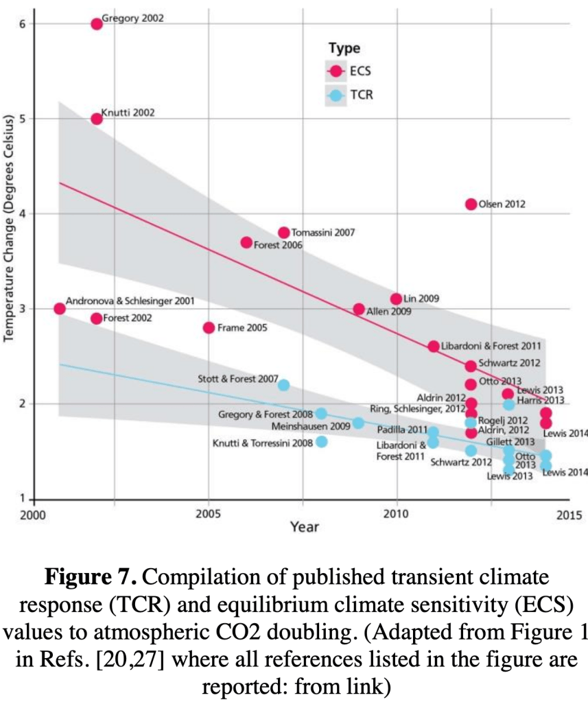 Figure 7 from Scafetta et al 2017 does a good job of graphically illustrating this evolution by plotting the estimates of the Equilibrium Climate Sensitivity (ECS) and Transient Climate Response (TCR) to CO2 from research papers vs the year published, from 2000 to 2015.